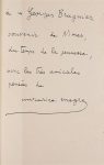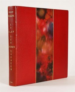 MAGRE (Maurice). LE CLEF DES CHOSES CACHEES. Paris, Charpentier, Fasquelle, 1935. Petit in-4°, demi maroquin grenat à bandes, filets dorés sur les plats, dos lisse orné, couvertures et dos, entièrement non rogné (étui). Edition originale. L'UN DES 20 EXEMPLAIRES NUMEROTES SUR HOLLANDE, entièrement non rogné. Exemplaire unique contenant une dédicace manuscrite de l'auteur, une feuille du manuscrit original avec de nombreuses ratures, et surtout 44 DESSINS AU CRAYON ET AQUARELLES ORIGINALES signés de divers artistes dont la moitié exécutées par Max Théron (1873-1936), peintre et graveur lodévois. Bel exemplaire.