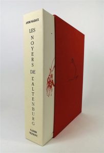 MALRAUX (André). LES NOYERS DE L'ALTENBURG. Paris, Les Amis du Livre Contemporain, 2003. In-4°, en feuilles sous chemise et étui de l'éditeur. 16 eaux-fortes et lithographies originales en noir, dont 9 à double page de VLADIMIR VELICKOVIC. Tirage à 220 exemplaires numérotés sur Arches, celui-ci l'un des 180 nominatifs réservés aux sociétaires et signés par l'artiste, avec l'une des 40 suites (n°15) des illustrations toutes numérotées et signées. Bel exemplaire enrichi du menu illustré et signé avec un envoi manuscrit de l'artiste.