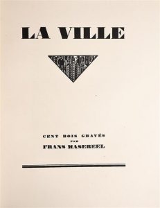MASEREEL (Franz). LA VILLE. Paris, Albert Morancé (1925). In-4°, demi velin bradel, titre calligraphié au dos, couv. et dos (Barast). Edition originale et premier tirage de cette collection de 100 beaux bois originaux de MASEREEL. Tirage limité à 275 exemplaires, celui-ci numéroté sur Arches avec la signature de l'artiste. Très petites galeries sur le premier plat, sinon bel état.