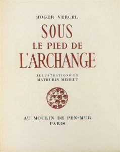 (Méheut) - VERCEL (Roger). SOUS LE PIED DE L'ARCHANGE. Paris, Moulin de Pen-Mur (1947). In-4°, en feuilles. Belle publication ornée de 64 illustrations gravées sur bois par Mathurin Méheut. L'UN DES 100 EXEMPLAIRES numérotés sur vélin du Marais, avec une suite en noir des illustrations. Une planche froissée.
