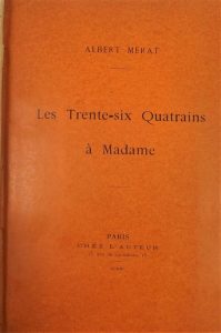 MERAT (Albert). LES TRENTE SIX QUATRAINS A MADAME. Paris, chez l'auteur, 1903. In-8, demi percaline bleue, couv. (reliure de l'époque). Édition originale. Relié à la suite du même : LES TRENTE-SIX DEDICACES pour les trente-six quatrains à Madame (EO, 2 ex.). Chaque volume est enrichi d'envoi autographe adressé à Joseph Uzanne.