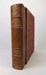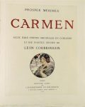 MÉRIMÉE (Prosper). CARMEN. Paris, Éditions d'art de l'intermédiaire du bibliophile, 1929. In-4° en feuilles, couverture rempliée, chemise demi-basane brune et étui. Illustré de 16 eaux-fortes originales en couleurs et 10 pointes sèches de LEON COURBOULEIX. Tirage unique à 110 exemplaires, celui-ci l'un des 85 sur velin teinté contenant deux états des planches dont un avec remarques, et un état des lettrines et des culs-de-lampe. Etui frotté.