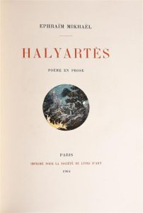 MICKAËL (Ephraïm). HALYARTES. Paris, Société du Livre d'Art, 1904. In-8, maroquin acajou, dos à nerfs, encadrement intérieur orné, doublure et garde de soie mordorée, doubles gardes, tranches dorées sur témoins, couvertures et dos, étui bordé (Noulhac). Nombreuses fines compositions in et hors-texte en couleurs de PAUL GERVAIS. TIRAGE UNIQUE A 100 EXEMPLAIRES numérotés sur Arches, celui-ci, nominatif et réservé à l'un des membres de la Société, enrichi d'une double suite des illustrations en noir dont l'eau-forte pure et d'une belle AQUARELLE ORIGINALE SIGNEE. Très bel exemplaire parfaitement relié par Noulhac.
