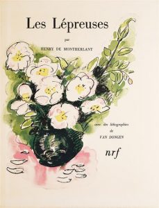 MONTHERLANT (Henry de). LES LEPREUSES. Lithographies de Van Dongen. Paris, NRF, 1946. In-4°, en feuilles, sous chemise et étui de l'éditeur. Orné de 25 superbes lithographies en couleurs in et hors texte de KEES VAN DONGEN reproduites par Mourlot Frères et Lucien Détruit. Tirage à 390 exemplaires, celui-ci numéroté sur Rives BFK. Parfait état.