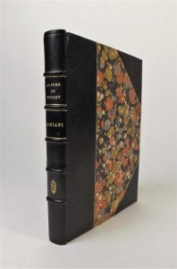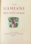 MUSSET (Alfred de). GAMIANI OU DEUX NUITS D'EXCES. Se trouve à Genève, à l'Enseigne du Chat pour Chat, 1926. In-8, demi-maroquin ébène à coins, dos à nerfs. Orné d'un frontispice et de 32 compositions « libres » coloriés au pochoir d'ANDRE DIGNIMONT. Tirage limité à 420 exemplaires, celui-ci l'un des 375 numérotés sur Hollande. (Dutel, II, 1638). Ex-libris Jacques Rasdolsky. Bon exemplaire malgré quelques taches sur certaines pages.
