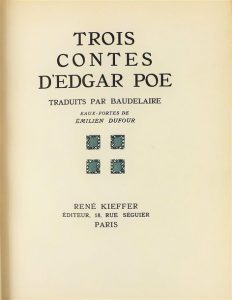 POE (Edgar). TROIS CONTES. Traduction de Charles Baudelaire. Paris, Kieffer, 1927. In-8, cuir brun imitant la peau de serpent, titre à froid sur le premier plat, dos à nerfs, tête dorée, couvertures et dos (reliure de l'éditeur). Illustré de15 belles eaux-fortes en deux tons d'EMILIEN DUFOUR. Tirage limité à 550 exemplaires, celui-ci l'un 450 numérotés sur vélin de cuve, enrichi d'un DESSIN ORIGINAL REHAUSSE à l'aquarelle signé de l'artiste. Bon exemplaire.