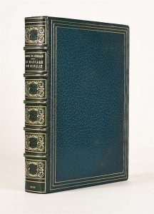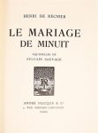 RÉGNIER (H. de). LE MARIAGE DE MINUIT. Aquarelles de Sylvain Sauvage. Paris, André Plicque, 1926. In-4°, maroquin bleu vert, triple filet doré sur les plats, décor doré à l'intérieur des plats, double garde, dos à nerfs très orné, t. dorée, couv. et dos, étui bordé (Durvand et Pinard). Très bel exemplaire finement relié et illustré de 44 illustrations en couleurs d'après les aquarelles de SYLVAIN SAUVAGE. L'un des 450 exemplaires numérotés sur velin de Rives.