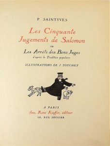 SAINTYVES (P.). LES CINQUANTE JUGEMENTS DE SALOMON. Paris, Kieffer, s.d. In-4°, broché, couverture illustrée. Nombreuses illustrations in et hors-texte en couleurs de JACQUES TOUCHET. Tirage limité à 550 exemplaires, celui-ci L'UN DES 50 NUMEROTES SUR JAPON contenant une suite des dessins en sanguine et une AQUARELLE ORIGINALE. Bonne condition.