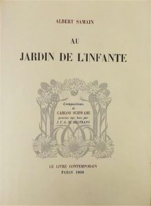 SAMAIN (Albert). AU JARDIN DE L'INFANTE. Compositions de Carlos Schwabe. Paris, Le livre contemporain, 1908. In-4° en feuilles sous chemise et étui de l'éditeur. Illustré par CARLOS SCHWABE d'un frontispice et de 9 compositions hors texte à pleine page en 2 tons et d'encadrements à chaque page gravés sur bois. Tirage unique à 120 exemplaires numérotés sur velin. Exemplaire contenant 3 essais supplémentaires du frontispice, nominatif pour M. Mouravit. Bel état.