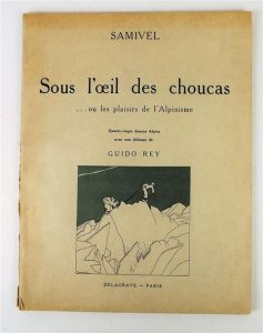 SAMIVEL. SOUS L'OIL DES CHOUCAS. OU PLAISIR DE L'ALPINISME. Paris, Delagrave, 1932. In-4° broché.             Illustré de 80 dessins alpins de SAMIVEL et avec une adresse de Guido Rey. Couvertures salies, défauts au dos.