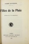 SAVIGNON (André). FILLES DE LA PLUIE (SCENES DE LA VIE OUESSANTINE). Paris, Grasset, 1912. In-12, demi chagrin terre de Sienne à coins, t. dorée, couv. et dos, non rogné (Devauchelle). Edition originale. Savoureux mémoires sur la vie bretonne au début du siècle, l'ouvrage obtint le prix Goncourt dès sa sortie. Bel exemplaire, L'UN DES 30 NUMEROTES SUR HOLLANDE.