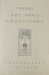 TOULET (Paul-Jean). LES TROIS IMPOSTURES. Paris, Creuzevault, 1946. In-8, en feuilles, sous couverture rempliée, chemise et étui. Fines illustrations en couleurs de JEAN-ÉMILE LABOUREUR. Exemplaire numéroté sur Rives. Étui un peu Sali.