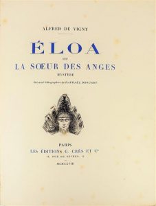 VIGNY (Alfred de). ÉLOA OU LA SOEUR DES ANGES. Paris, Crès, 1928. In-4°, demi-velin bradel ivoire, titre calligraphié au dos, couvertures et dos conservés. 19 lithographies de RAPHAËL DROUART. Tirage à 100 exemplaires, celui-ci hors commerce numéroté sur Rives. Rousseurs éparses, piqures au dos.
