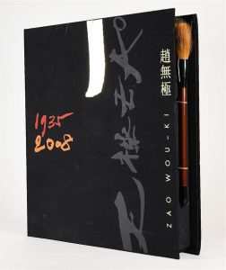 VILLEPIN (Dominique de). ZAO WOU-KI. Paris, Flammarion, 2009. In-4°, cartonnage illustré, sous coffret de toile noire illustrée fermé par pinceau.             Importante monographie abondamment illustrée des ouvres de ZAO WOU-KI. Tirage à 500 exemplaires, tous accompagnés d'une sérigraphie réalisée d'après une aquarelle de l'artiste, signée dans la planche et numérotée au revers, celui-ci n° 444.