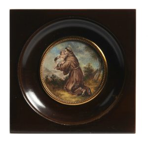 D'après Bartolomé Esteban MURILLO (1618-1682) Saint Antoine de Padoue adorant l'enfant Jésus Miniature sur ivoire Début XXe siècle Diamètre à vue : 6,5 cm Cadre : 13,5 x 13,5 cm L'oeuvre originale est conservée au musée des Beaux-Arts de...
