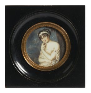 D'après Eulalie MORIN (1765-1837) Portrait de Madame Récamier Miniature sur ivoire, signée Larivière Diamètre à vue : 7 cm Cadre : 13,5 x 13 cm NB : L'oeuvre originale est conservée à Versailles. Objet fabriqué avant le 1er juin 1947...