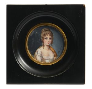 Ecole française dans le goût du XIXe siècle Portrait présumé de la Baronne de Vauréal Miniature sur ivoire, signée Marigny Début XXe siècle Diamètre à vue : 6 cm Cadre : 12 x 12 cm Objet fabriqué avant le 1er juin 1947 composé en tout ou...