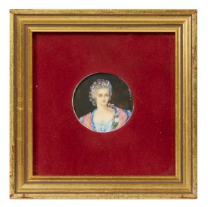 Ecole française d'après VAN LOO Portrait d'élégante à la coiffure perlée Miniature sur ivoire, annotée d'Vanloo. Début XXe siècle Diamètre à vue : 3,5 cm Cadre : 11 x 11 cm Objet fabriqué avant le 1er juin 1947 composé en tout ou en...