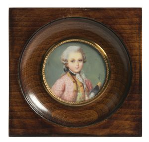 D'après Pietro Antonio LORENZONI (1721-1782) Portrait de Mozart enfant Miniature sur ivoire, signée Bussy Début XXe siècle Diamètre à vue : 6 cm Cadre : 12 x 12 cm NB : L'oeuvre originale, datée de 1763 et attribuée à Lorenzoni est...