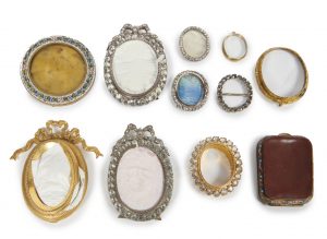 Lot de petits cadres précieux ou porte-souvenirs en métal argenté ou doré, micro-mosaïque, etc... Au total 11 éléments