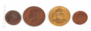7,5 cm Bon état, petits chocs. On y joint : - D'après HART Médaille en bronze doré, à l'effigie en haut relief du roi Léopold Ier à l'avers et d'une allégorie à l'antique au revers. Editée pour l'inauguration du chemin de fer de Verviers à Aix-la-Chapelle le 15 octobre 1843. Diamètre : 7,4 cm (petits chocs) - Médaille en bronze à patine brune figurant à l'avers le portrait du roi Léopold Ier et au revers une allégorie surmontant une locomotive à vapeur. Diamètre : 5,5 cm (chocs) - Médaille en bronze à patine brune figurant à l'avers le portrait du roi Léopold Ier. Diamètre : 5 cm