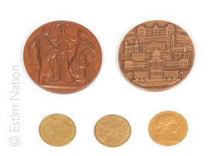 doré figurant le château de Cheverny et le château de Chambord (Diamètre : 3,5 cm), une médaille en bronze patiné figurant les monuments parisiens à l'avers et signée Delannoy, marquée au revers Paris VIe arrondissement (diamètre : 7 cm), dans un écrin, petite médaille en métal doré à décor de l'allégorie de la république, (diamètre 3,6 cm)