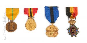 commémorative du règne d'Albert I en bronze à décor à l'avers du portrait dur roi soldat et marqué au revers des dates 1909-1934 et du A couronné, et son ruban de satin jaune à liseré vert. Diamètre : 3,3 cm - Médaille honorifique civile Union professionnelle belge en métal doré et argenté à décor émaillé et son ruban orné d'une rosette aux couleurs de la Belgique. Hauteur : 5 cm - Hauteur totale : 9 cm - Médaille civile "L'union fait la force" en bronze doré à décor d'une croix et un lion marchant à l'avers et chiffrée au revers, et son ruban de satin noir et bleu. Hauteur : 4,5 cm