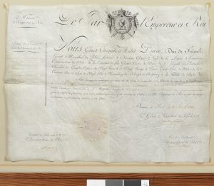 Rare brevet de Tranchant de la Maison de l'Empereur et Roi sur parchemin, aux grandes armes impériales, décerné par le grand maréchal du palais Duroc, Duc de Frioul, au Sieur Wery Herman Joseph, le 1er avril 1811, signé : "Duc de Frioul"