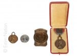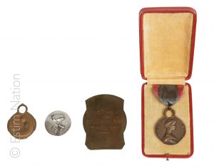 humanitaires envers les belges avant 1919. Diamètre : 3,6 cm On y joint une autre médaille au modèle sans ruban, un jeton souvenir en métal argenté à l'effigie de la reine Elisabeth (Diamètre : 3,4 cm) et une médaille rectangulaire en bronze dorée à l'effigie de la reine à l'avers et gravée au revers "Grand prix de SM Elisabeth Ougrée, 1936" (Hauteur : 7 cm - Largeur : 5 cm)