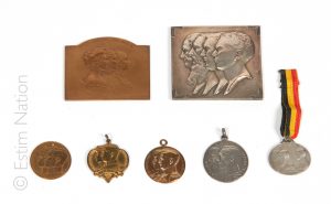 artis photographicae Cortraci in Belgio 1938" au revers. Hauteur : 6 cm - Largeur : 6,5 cm - D'après Joseph WITTERWULGHE (1883-1967) Médaille en bronze naturel figurant les reines de Belges Louise d'Orléans, Marie-Henriette d'Autriche et Elisabeth de Bavière. Signée Hauteur : 5 cm - Largeur : 6 cm On y joint : -une médaille en métal argentée figurant à l'avers les rois Léopold I, Léopold II et Albert I et au revers les reines Louise d'Orléans, Marie-Henriette d'Autriche et Elisabeth de Bavière. Hauteur : 2,5 cm - quatre médailles commémoratives et souvenir à l'effigie du roi Albert Ier et de la reine Elisabeth de Bavière.