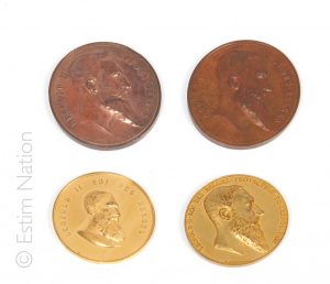 médaille en bronze doré à l'effigie du roi des belges Léopold II, "protecteur de l'exposition" à l'avers, et au revers à décor d'une allégorie des arts et des industries, marquée "Exposition Universelle d'Anvers 1885". Diamètre : 6 cm - D'après Jules BAETES (1861-?), deux médailles en bronze à patine brune à l'effigie du roi des belges Léopold II à l'avers et au revers à décor d'un globe terrestre, marquées "Exposition universelle d'Anvers 1894". Signées. Diamètre : 6 cm
