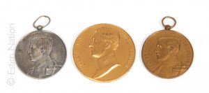 D'après DELPORTE Médaille en bronze doré figurant à l'avers le portrait du roi Albert Ier et au revers marquée Exposition de l'Oeuvre Belge, Bruxelles 1910. Diamètre : 6 cm Chocs On y joint : - Médaille en métal argenté à l'effigie du Roi...