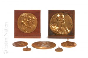 similaire sans socle en laiton non poli (Diamètre 7 cm) - d'après Alphonse MAUQUOY (1880-1954) Médaillon en laiton figurant la reine Astrid et un de ses fils, signé. Diamètre : 6 cm - Socle en bois : Hauteur : 8,5 cm - Médaille en laiton à l'effigie de la reine Astrid en buste de gauche, signée Diamètre : 4,5 cm - Médaille souvenir en hommage à la reine Astrid en métal à l'effigie de la reine, buste à gauche. Diamètre : 2,5 cm - Médaille en métal figurant le couple royale Léopold III et Astrid de Suède, buste de gauche. Diamètre : 2,5 cm - Médaille en bronze doré à l'effigie du roi Léopold III buste de droite à l'avers, annotée syndicat d'élevage de Beauraing 1937 au revers. Diamètre : 4,5 cm