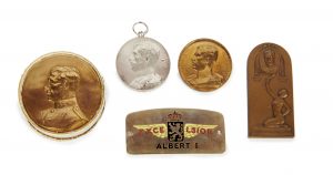 Lot de 6 médailles dont 3 en bronze et plaques diverses à l'effigie d'Albert 1er de Belgique Diamètres : 5 à 7 cm