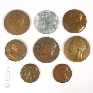 Lot de 7 médailles en bronze représentant des souverains de Belgique : - 2 médailles commémoratives du mariage de Baudouin et Fabiola (15/12/1960), l'une d'après FONSON pour la Croix Rouge de Belgique (diamètres : 5.1 et 7.1 cm) - médaille du...