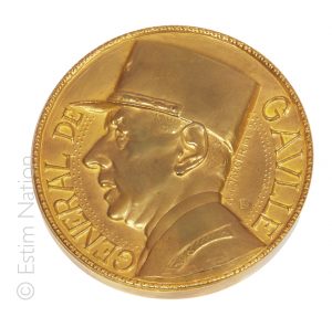 Albert de JAEGER (1908-1992) Grande médaille commémorative du Général de Gaulle en bronze doré à l'or fin figurant un portrait en buste du général à l'avers et le monument de Colombey-les-deux-églises au revers. Signée de la signature...