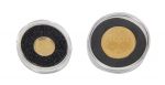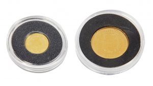 2 pièces en or émises par la Société française des monnaies : - Pièce Napoléon Bonaparte en or 999/1000e, poids : 0,50 gr, diamètre : 10 mm. Avec certificat. - Pièce 10e anniversaire du dernier franc en or 585/1000e, poids : 2 gr., diamètre...