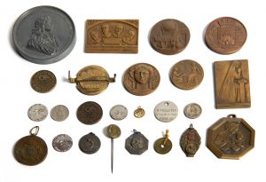 sténographique de France, Vierge à l'enfant, communiante en prière d'après Marcel Renard, Colbert d'après M. Bertonnier. La plupart en écrin. Diamètres : 4 à 8 cm. On joint un petit lot de pièces, jetons ou médailles pendentif.