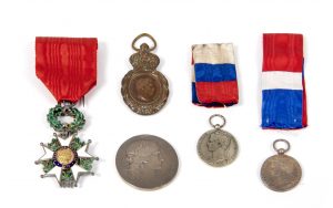 2 décorations : - Ordre de la légion d'honneur. Etoile de chevalier en argent et émail avec ruban. Poinçon tête de sanglier. (TBE) Avec écrin. - Médaille de Sainte-Hélène (instituée en 1857) en bronze à décor de profil de Napoléon (BE)...