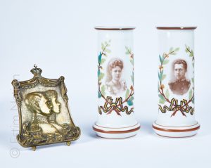 Albert Ier et Elisabeth de Belgique Portrait de profil du couple royal en bronze à décor de la couronne de Belgique surmontant une draperie. Circa 1920-30 Hauteur : 21,5 cm - Largeur : 15,5 cm On y joint : Paire de vases en opaline blanche à...