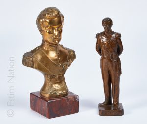 Georges FLAMAND (1895-1925) Albert Ier en buste Epreuve en bronze naturel, signé au dos. Sur un socle de marbre rouge. Hauteur : 14 cm - Largeur : 11 cm - Profondeur : 6 cm Hauteur totale : 17,5 cm On y joint un sujet en régule à patine brune...