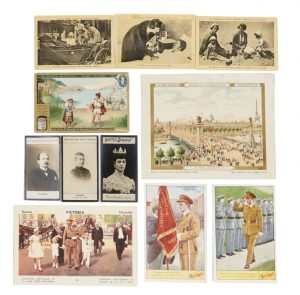 Lot d'environ 250 vignettes ou cartes postales publicitaires anciennes vers 1900 dont : - Liebig (env. 80) : Vie de la Reine Astrid, le Roi Albert... - Côte d'or (env. 20) : Reine Astrid... - Coll. Felix Potin, Chocolats Derossy (env. 50) : Rois et...