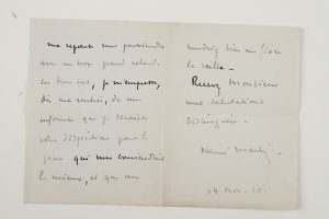 Lettres de peintres et sculpteurs, à propos de visites d’ateliers, de présentations à des collectionneurs, de l’état de leurs travaux, d’expositions, etc. Louise Abbéma (3, plus une copie), Albert Bartholomé, René Billotte, Fernand Legout-Gérard, Madeleine Lemaire (4, plus un carton d’invitation impr.), Henri Le Sidaner, G. H. Marchetti, Claudius Marioton, Laurent Marqueste, Henri Martin (2), Luc-Olivier Merson (2), Mathurin Moreau, Aimé Morot.