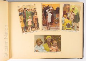 Environ 95 cartes publicitaires en couleurs Côte d'Or sur le thème de la Reine Astrid Réunies dans un album éditeur, contrecollées. Epoque vers 1930-40. (Assez bon état)