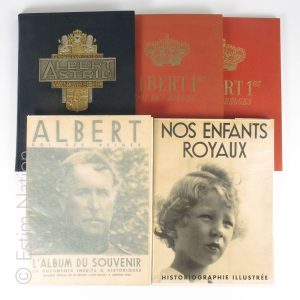 Lot de 5 ouvrages illustrés réunis sur le thème de la royauté belge, époque vers 1930-40 : - Ter nagedachtenis van ALBERT ASTRID van Belgie. 600 photographische documenten uitgevoerd in kunst-koperdiepdruk. 1 vol. numéroté 2618, reliure aux...