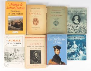 Ensemble de volumes brochés, reliés et modernes formant documentation, comprenant essais et biographies sur le thème des familles royales et impériales de France, et divers certains illustrés. 22 volumes comprenant notamment : - Letizia, mère...