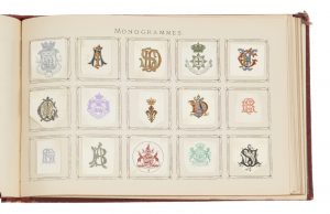 Album à reliure de cuir bordeaux à décor estampé et caractères dorés comprenant une collection de monogrammes peint ou gravés des grandes familles européennes. XXe siècle, réunion artisanale. Hauteur : 16,5 x 25 cm (Usures, incomplet)