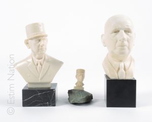 Lot de trois bustes en résine représentant le Général Charles De Gaulle sur des socles en pierre. Hauteur : de 8 à 20 cm