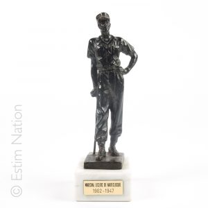 "Maréchal Leclerc de Hautecloque" Epreuve en bronze à patine brune, traces de signature sur la terrasse et cachet de fondeur, numérotée 129/400. Repose sur un socle en marbre blanc (petites ébrechures) Hauteur totale : 20 cm