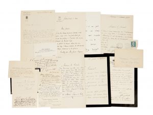 de l'évêque de Gand sur papier à entête, datée du 14.6.33 - carte de visite avec mention manuscrite de l'évêque de Bruges - carte de visite du chanoine Rodolphe Hoornaert avec mention manuscrite et signée - carte de visite de l'abbé Henri-Gaston Craccq, avec mention manuscrite - carte de visite de l'évêque de Tournay, avec mention manuscrite et datée du 6 janvier 1931 - carte de remerciement et son enveloppe à l'attention de Madame Crouquet de Monseigneur de Cro - carte de visite de Léon Sasserath, sénateur de Naumur-Dinant - carte de visite du comte Pierre de Lichtervelde avec autographe et signature datée 30/12/30 - carte de visite du baron Pierre Nothomb avec mention manuscrite - carte de visite dans son enveloppe avec mention manuscrite de Adolphe Max, Bourgmestre de la ville de Bruxelles - lettre autographe signée sur papier à entête de Augustin Edouard Michel du Faing d'Aigremont (1855-1931, général de l'armée Belge) - Lettre autographe signée et datée 27 avril 1910 sur papier à entête de l'adjudant général chef de la Maison Militaire du Roi - lettre autographe signée datée 5 février 1923, sur papier à entête des Musées royaux du Cinquantenaire - lettre autographe signée d'Henri comte de la Barre d'Erquelinnes (1885-19661, homme politique belge), datée 20.5.1930, sur papier à entête du Sénat - lettre autographe signée du comte Henry Carton de Wiart (1869-1951, homme politique belge) - lettre autographe et son enveloppe, signée de Marie Joseph Anatole Élie, prince de Chimay (1858-1937), sur papier à entête du Jockey club - lettre autographe signée du Vicomte Adrien Vilain XIIII (1861-1940), sur papier monogrammé - lettre autographe et son enveloppe, signée du prince Henri de Cro (1860-1946, gentilhomme et militaire belge), datée du 26 mars 1932 - un autographe signé et daté 8.II.37 sur papier à entête du sénat de Belgique (Paul Crockaert ?) - lettre tapuscrite avec autographe et signé d'Albert François, datée du 24 novembre 1938 - lettre tapuscrite signée de G. Truffaut, échevin et député de Liège, sur papier à entête du cabinet de l'échevin de la ville de Liège, datée 1940 - lettre autographe signée d'Eugène Soudan (avocat), sur papier à entête, datée du 12.3.48. Bon état de l'ensemble, rousseurs, quelques déchirures. - lettre autographe signée du prince Henri de Cro (1860-1946, gentilhomme et militaire belge) datée du 6 juillet 1932